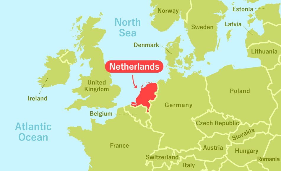 The Netherlands, located at the heart of Europe, is surrounded by Germany to the east, Belgium and France to the south, and lies across the North Sea from the United Kingdom to the west.
