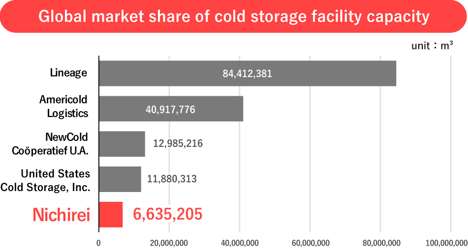 The Nichirei Logistics Group ranks fifth* in terms of global share of refrigerated warehouse equipment capacity.