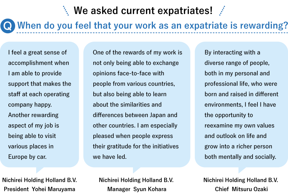 The work of expatriates often involves setting up new operations, which "sometimes feels exciting, like painting on a white canvas," says Nichirei Logistics Group employee Hazu, who has been stationed in the Netherlands for many years.