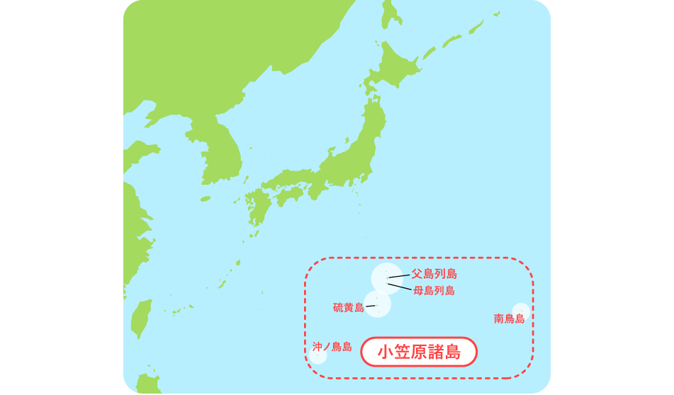 ここは、父島列島、母島列島をはじめ、硫黄島、日本最南端の沖ノ鳥島、日本最東端の南鳥島など、30あまりの島々からなる小笠原諸島です。