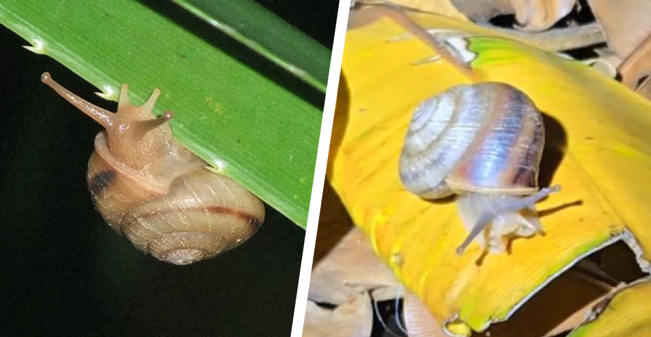 オトメカタマイマイ(左)とコガネカタマイマイ(右)